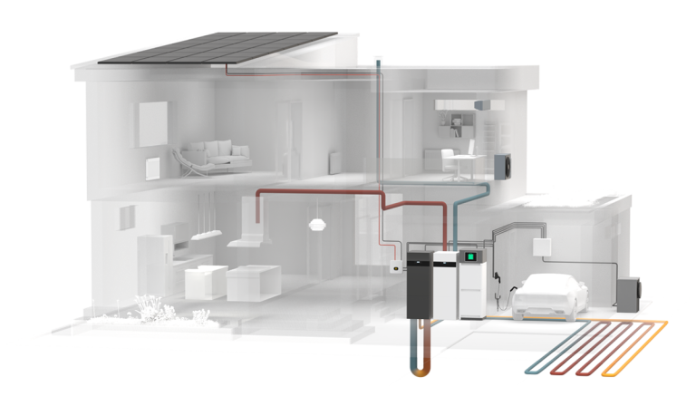 Jordvärmepumpen hämtar lagrad solenergi ur marken och värmer både hus och tappvatten via ett vattenburet system.